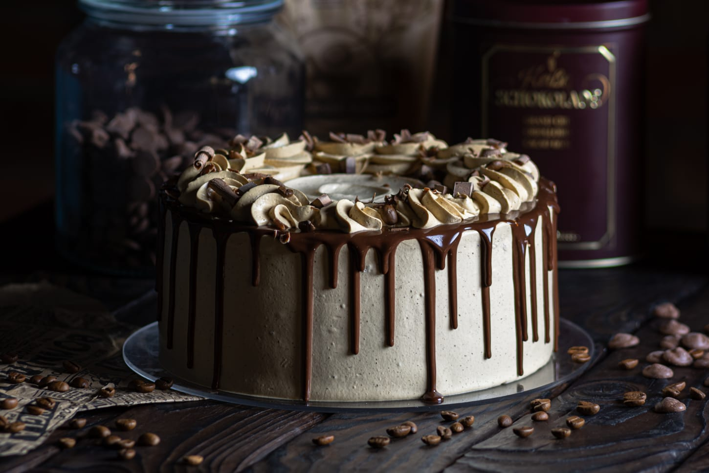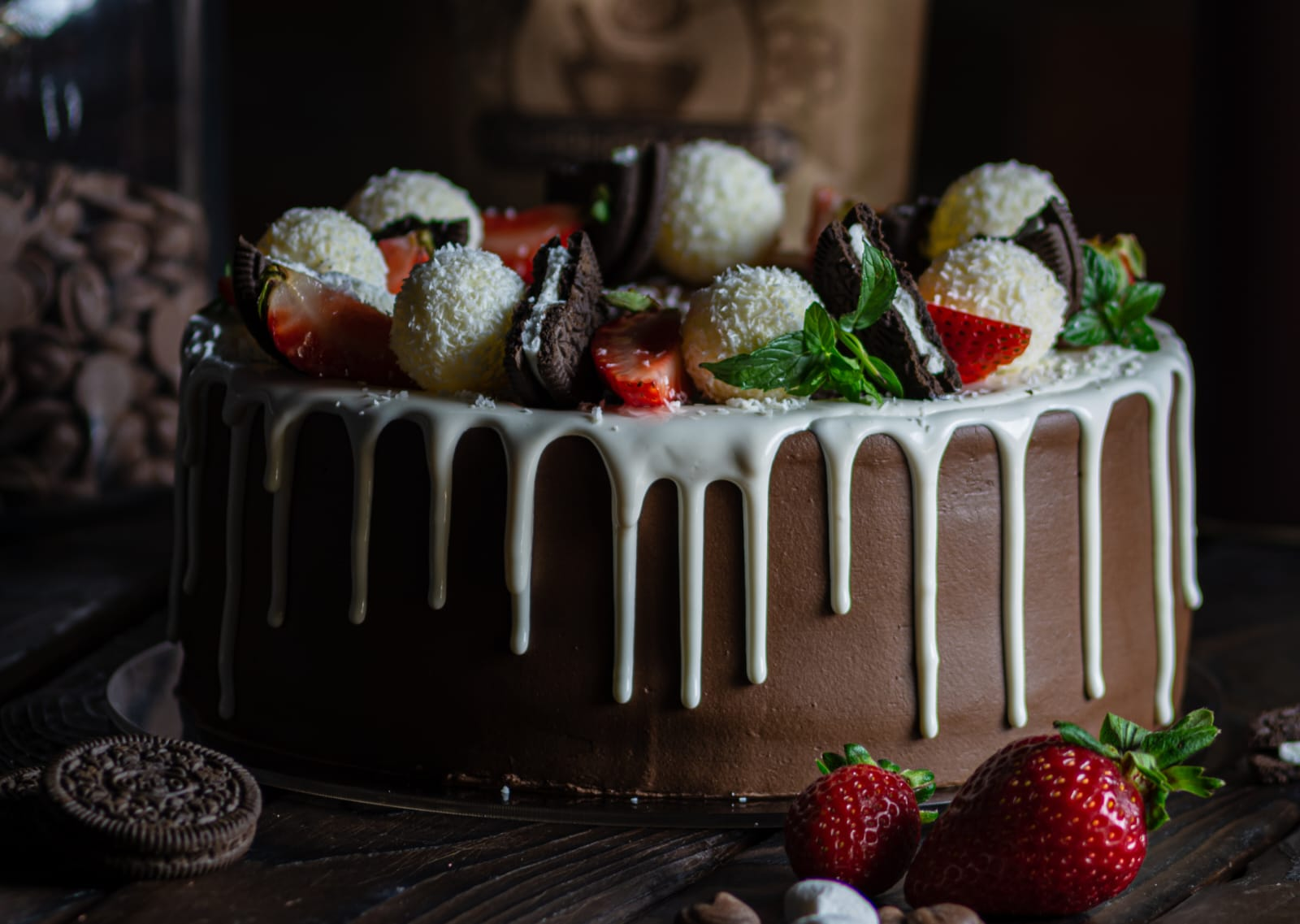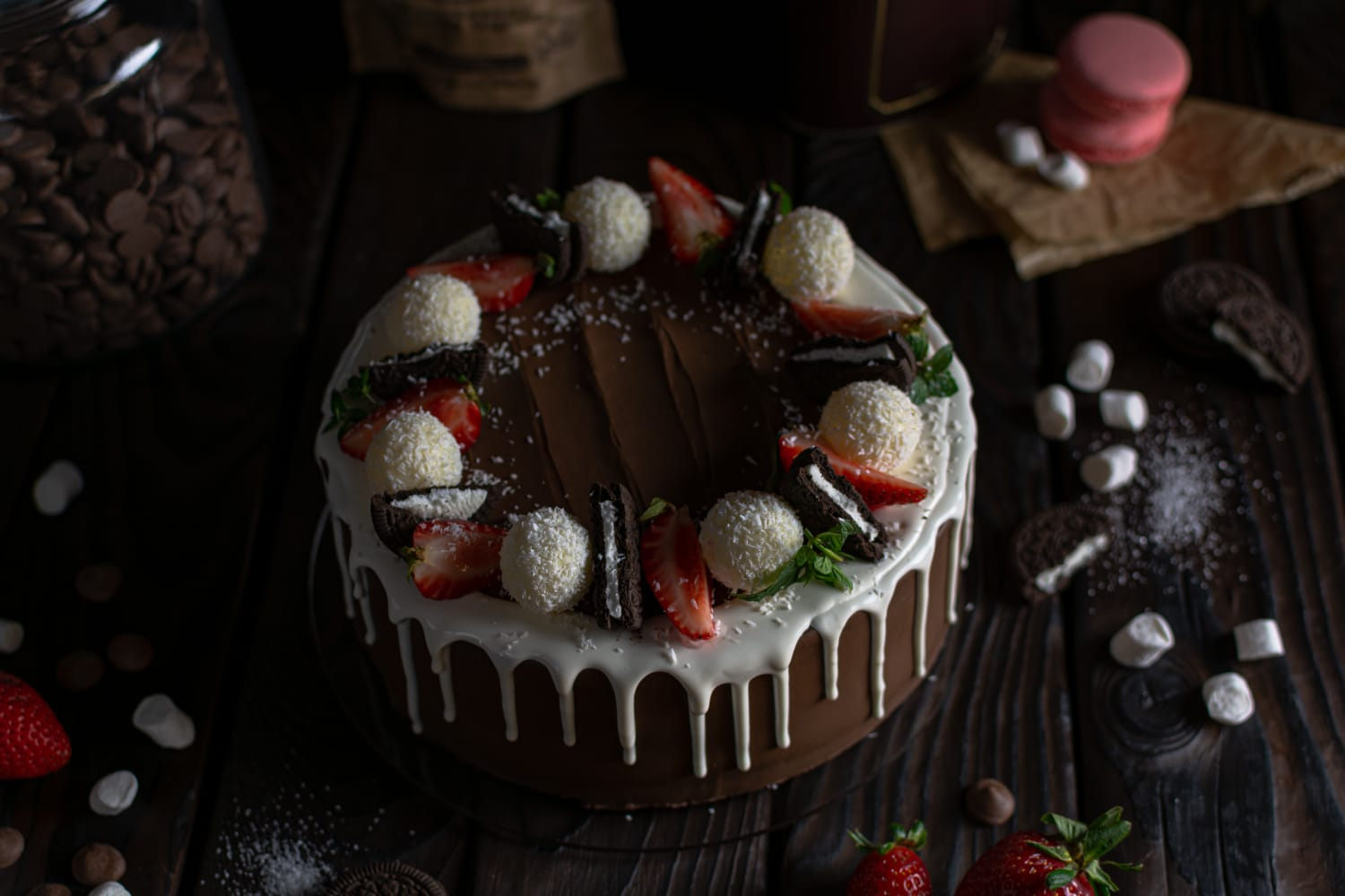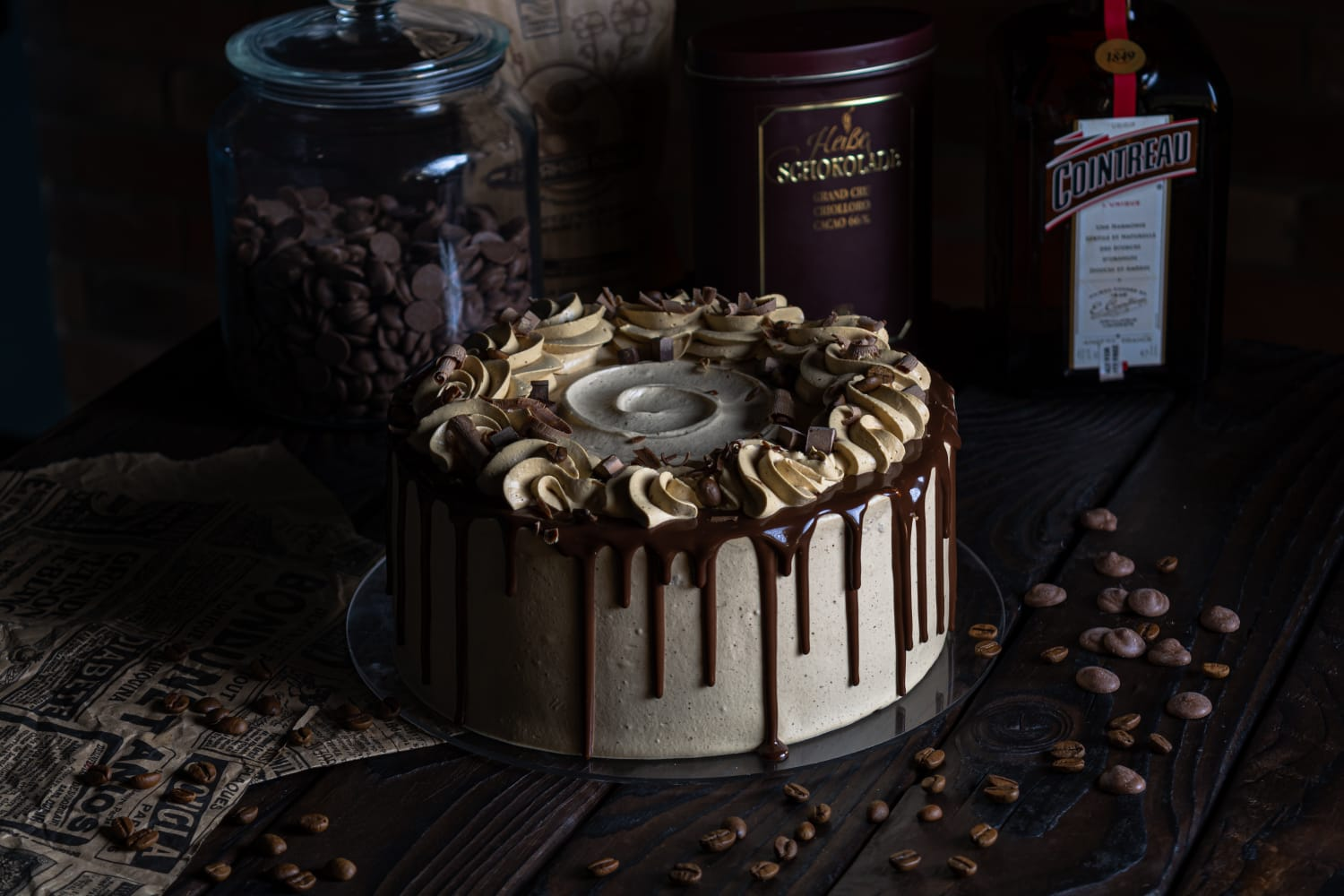 влажные шоколадные бисквит, нежный бархатистый крем на основе бельгийского молочного шоколада, кокосовая намелака.