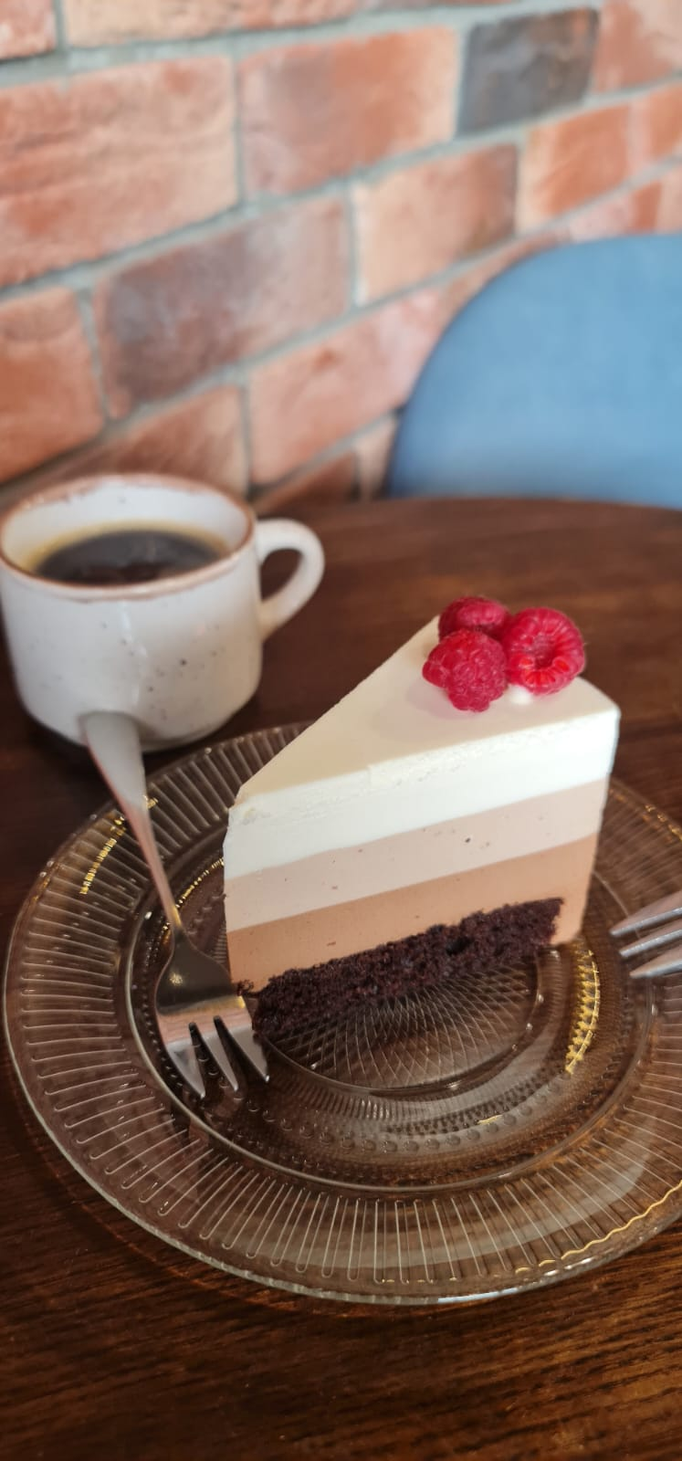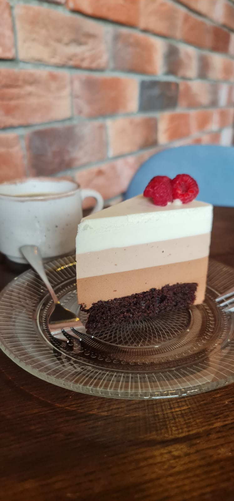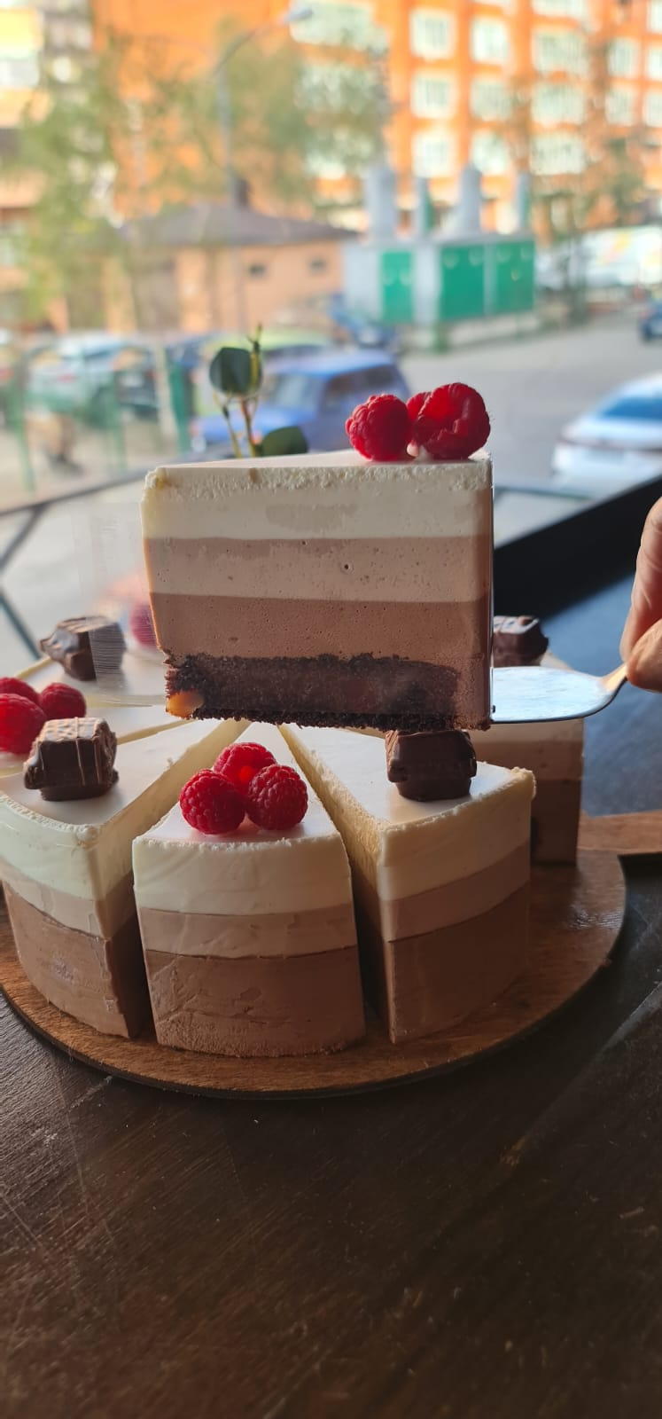 Торт на основе шоколадного бисквита состоящий из трёх муссов на основе бельгийского белого, молочного и тёмного шоколада.