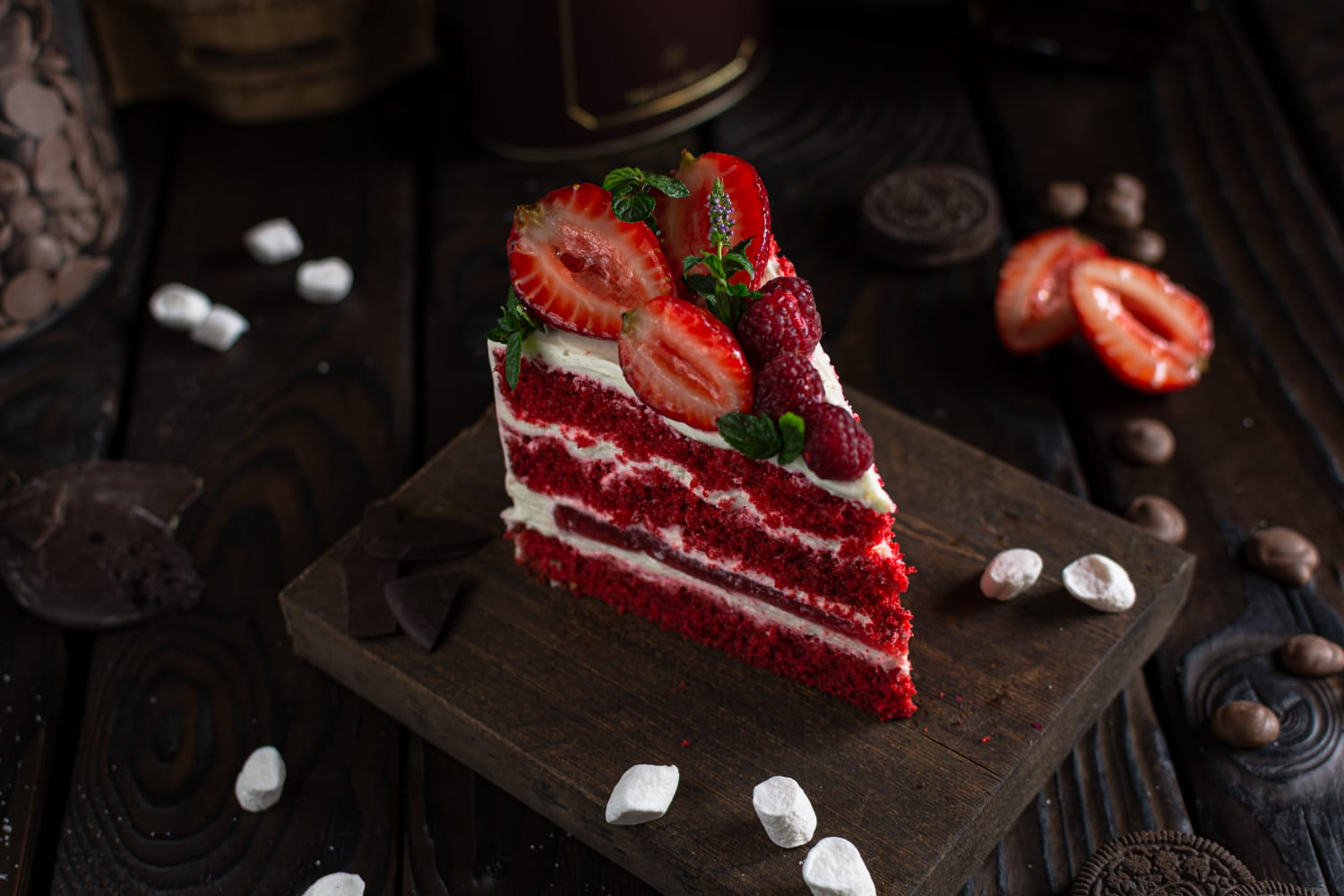 Торт с яркими, насыщенно-красными бисквитными коржами и контрастным белоснежным кремом на основе сливочного сыра Его отличительная особенность — нежная, бархатистая текстура и элегантное сочетание вкусов: шоколадно-ванильные нотки бисквита и сливочная гладкость крема с клубничной прослойкой внутри
